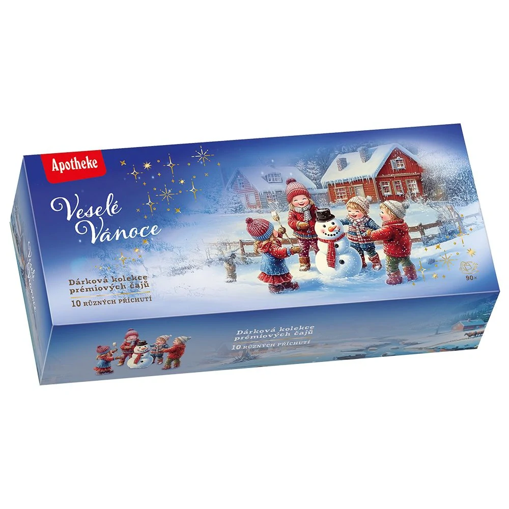 Apotheke Dárková kolekce Veselé Vánoce 90ks (10×9ns) je čajová kazeta připravená speciálně pro advent a vánoční období. Uvnitř se ukrývá 90 porcovaných čajových sáčků, rozdělených do deseti různých druhů čajů. Každý druh má jiný charakter – od jemně ovocných směsí přes výrazně kořeněné zimní čaje až po klidnější kombinace vhodné na večer.