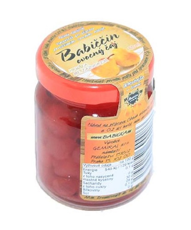Babiččin ovocný čaj je vynikající nápojový koncentrát s kousky ovoce bez jakýchkoliv konzervačních látek či barviv. Je to čistě přírodní produkt. Jednoduše zalijete horkou, či perlivou vodou a máte ovocem vonící lahodný nápoj.