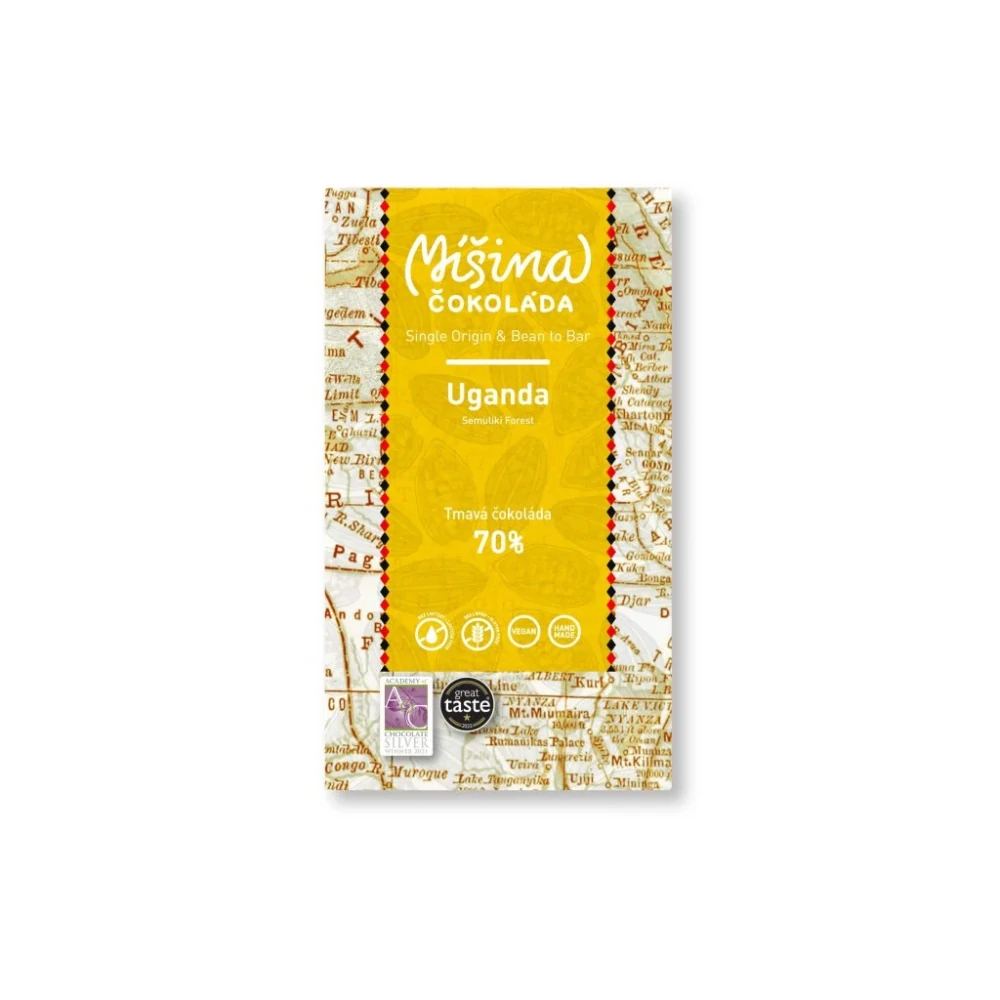 Kakaové boby z oblasti Semuliki Forest v Ugandě v sobě ukrývají bohatou, ale přitom elegantní chuť. V této ručně vyráběné tabulce od Mišiny čokolády se otevírají tóny sušených fíků, karamelu a lehce kořeněného podtónu, který dodává hloubku každému soustu.